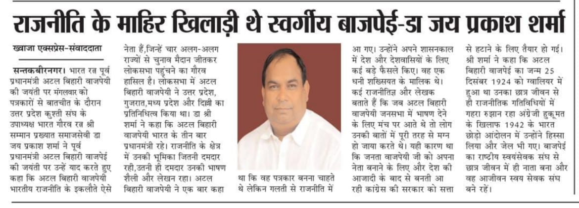 Posted on December 25, 2024December 30, 2024 by jaipraka राजनीती के माहिर खिलाडी थे स्व. अटल बिहारी वाजपेयी – डॉ. जय प्रकाश शर्मा Post navigationPrevious post: नव वर्ष सभी के जीवन में सुख समृद्धि सफलता ले आए-डा जय प्रकाश शर्माNext post: ठण्ड पड़ते ही डॉ जय प्रकाश शर्मा को याद करने लगी जनता